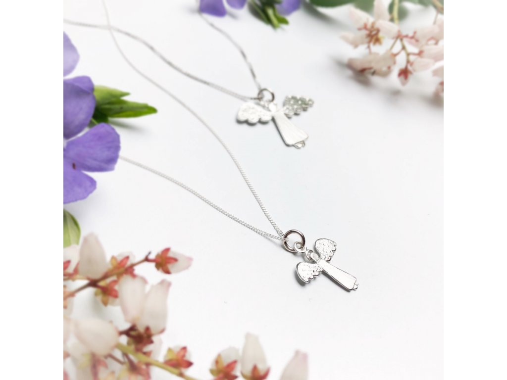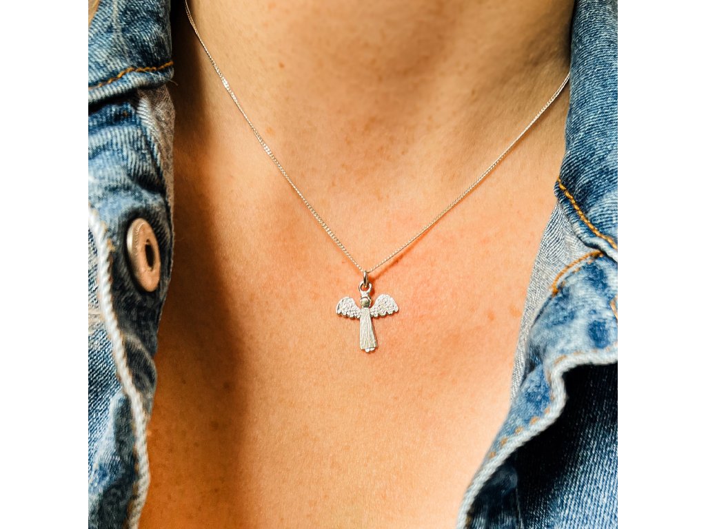 Náhrdelník Andílek mini je tvořen stříbrným řetízkem typu pancr s přívěškem. Andílek je stylizovanou postavičkou s křídly. Přední strana je zajímavá hlavně díky struktuře křidélek s tečkami a košilce s tepanými liniemi. Nad hlavičkou je malá svatozář, z ní přívěšek přechází v další malinké očko a větší očko na provléknutí řetízku.