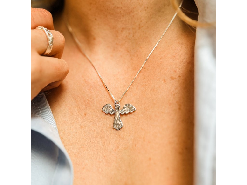 Náhrdelník Malý andělíček je tvořen stříbrným řetízkem typu kostka s přívěškem. Andílek je stylizovanou postavičkou s křídly. Přední strana je zajímavá hlavně díky struktuře křidélek s tečkami a košilce s tepanými liniemi. Nad hlavičkou je malá svatozář a očko na provléknutí řetízku.