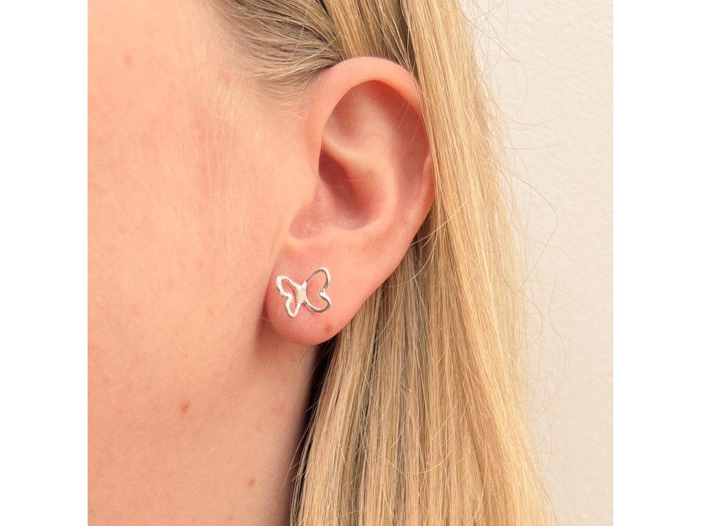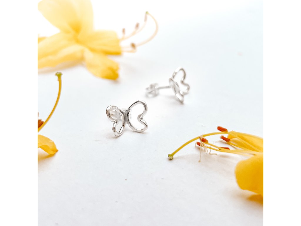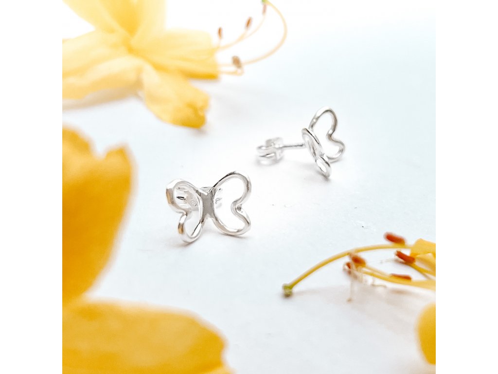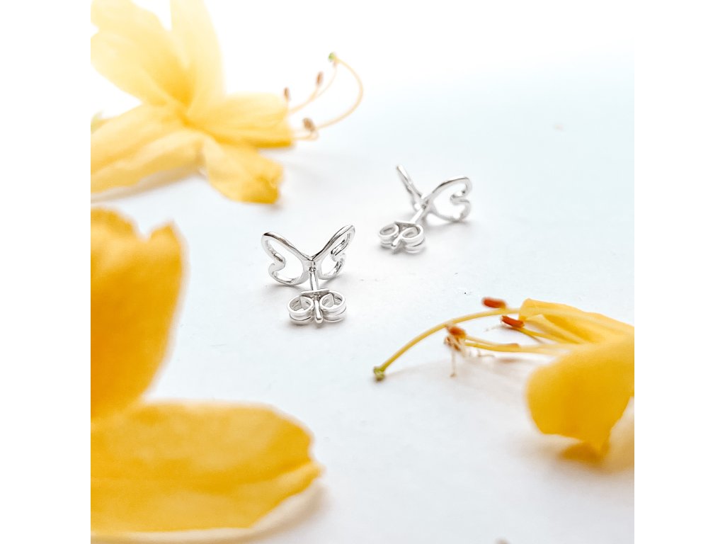 Náušnice Papillon jsou vytvořeny ze stříbra. Tvar obrysových motýlků je velmi minimalistický, jakoby nakreslený jedním rychlým tahem. K zavěšení slouží stříbrné tyčky s puzetami na zadní straně. Potěší Vás, hledáte-li originální a zároveň decentní náušnice do města, práce i divadla.