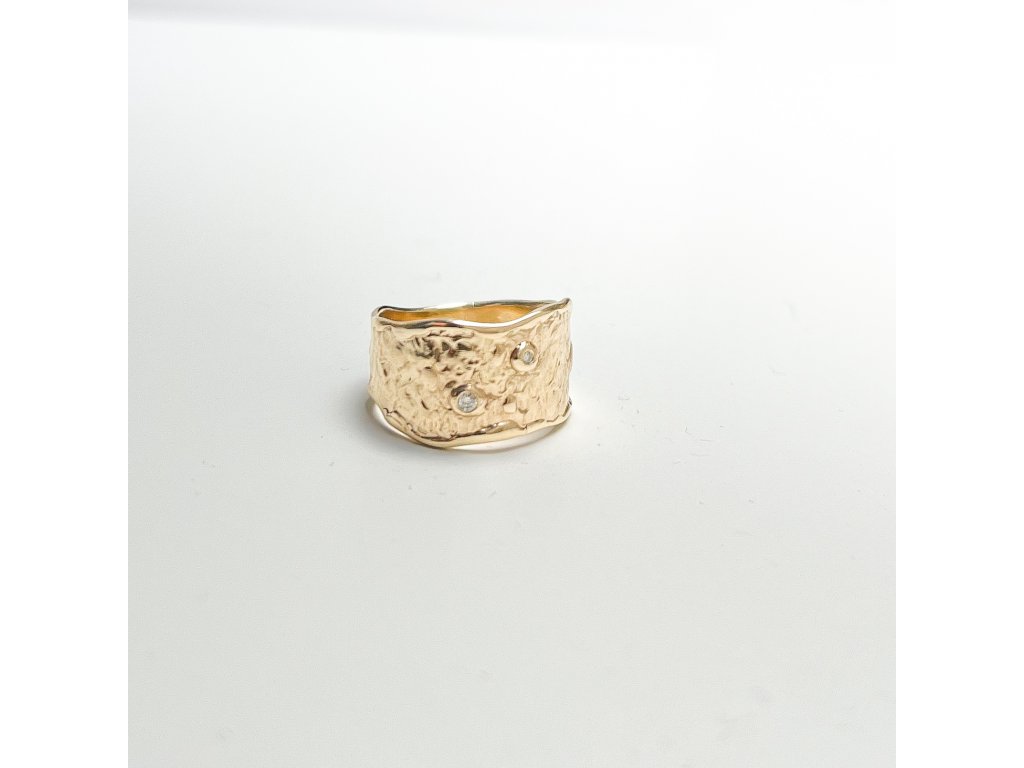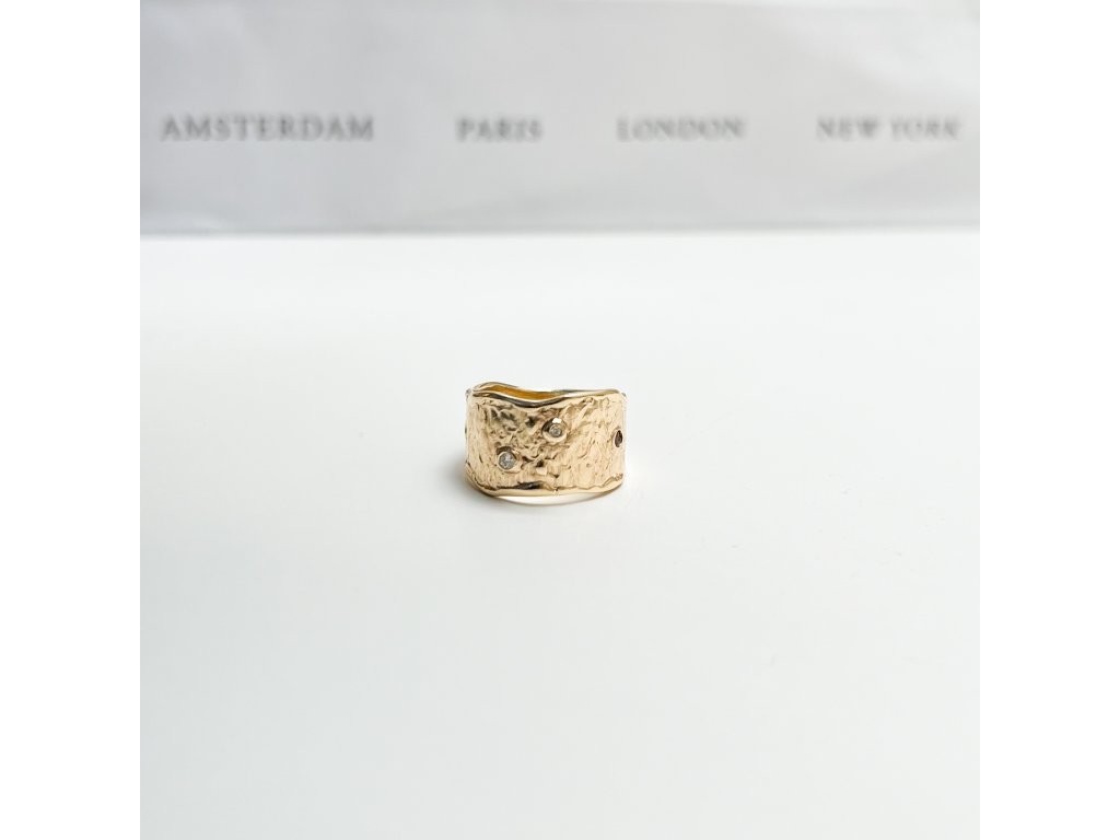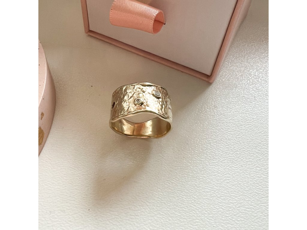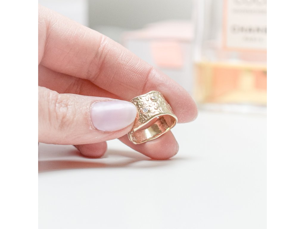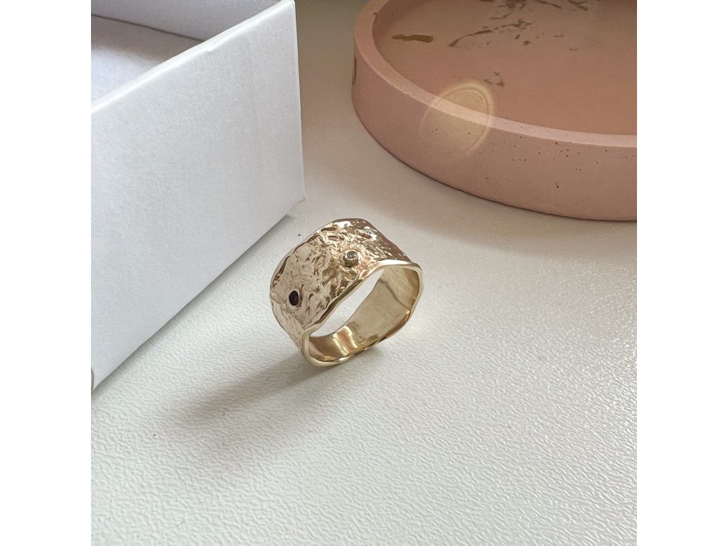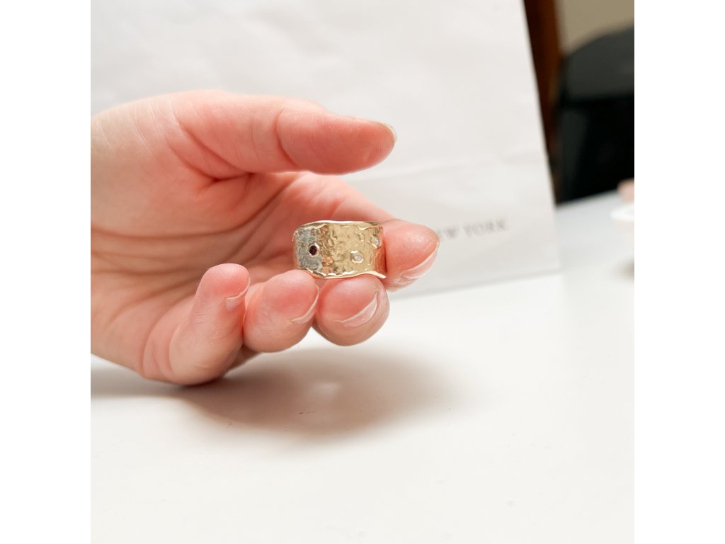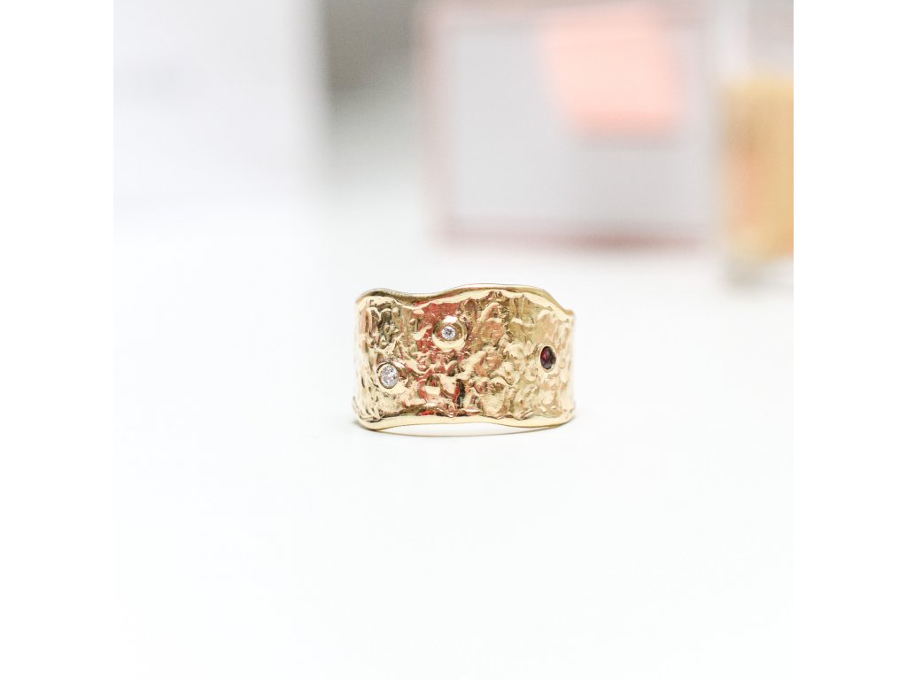 Prsten Touch vznikl v návaznosti na celou kolekci Touch. Jak název naznačuje, nosným motivem kolekce je dotyk. Na každém kousíčku povrchu šperku došlo k dotyku a vytvoření jedinečné struktury. Okraje prstene jsou mírně plastické. Vrstvy jakoby stékaly. Na čelní straně prstene jsou umístěny tři kameny, z čehož jsou dva přírodní broušené brilianty a jeden surový granát.